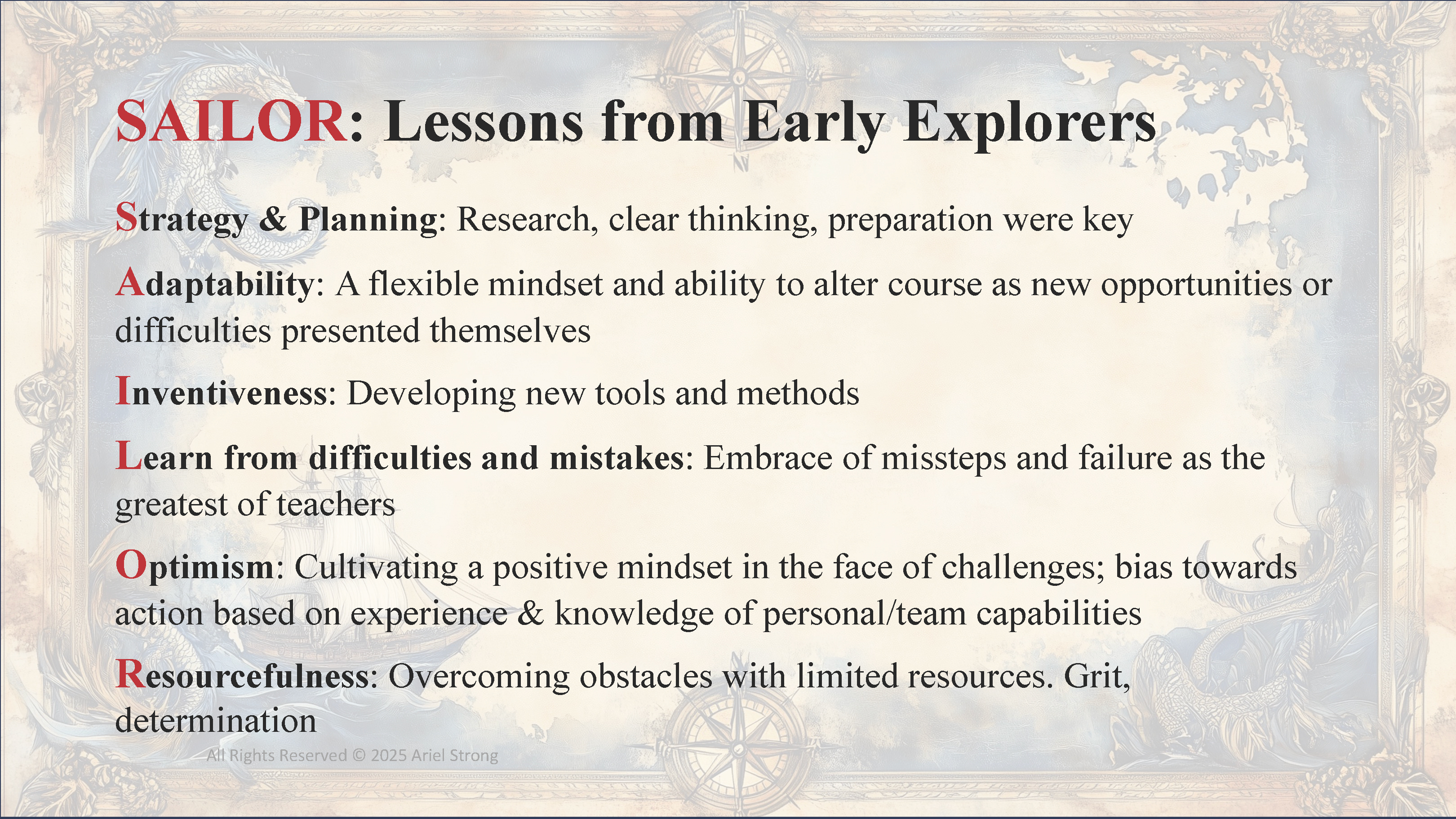 We have long been adventurers and explorers. The hard won knowledge, skills, and mindsets needed to thrive in earlier times of rapid change are still available to us. At root, this set of principles can be adapted to deal with nearly any situation that holds high potential risks and rewards.